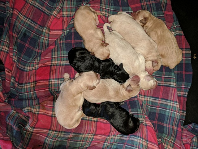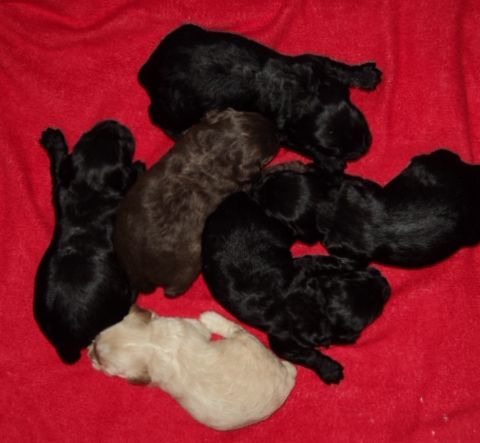 Our Trixie and Buck had 6 cockapoo puppies yesterday, May 7. W have 1 brown, 1 buff, and 2 black boys and 2 black girls.