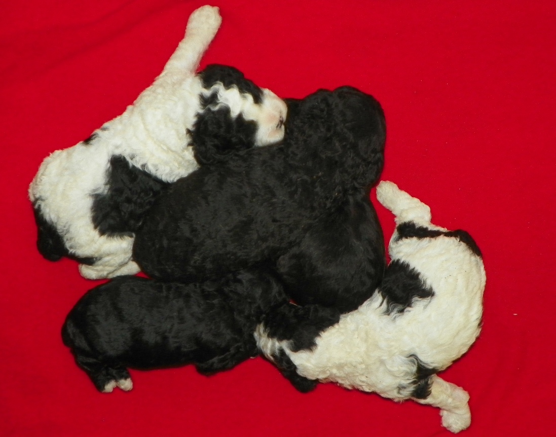 Labradoodle puppies are 4 weeks old and now listed on Puppies for Sale page under Labradoodles. We have 1 female and 1 male cream still available and 3 black males available. They will be ready for their new homes around the middle to end of January.