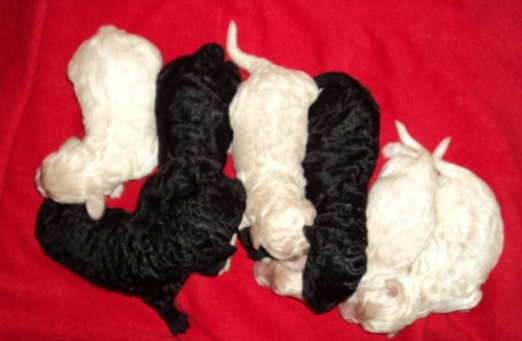 Here are the 4 cream males and the 1 black male available and 1 black female. Black male is the smallest of the litter. They are 3 weeks old today! Will be listed separately on the Labradoodle puppies for sale page in the next few weeks. Email if you want individual pictures before then.